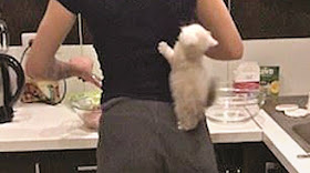 Impaciente por saber o que era um jantar, um gatinho chamado Bitcoin decidiu armar-se em ‘gato-aranha’ e trepar pelas pernas e costas da dona como se fosse uma montanha. O felino só descansou quando conseguiu chegar lá acima e espreitar por cima do ombro da dona para ver as iguarias que estava a preparar. O divertido momento foi gravado na Lituânia e partilhado nas redes sociais.